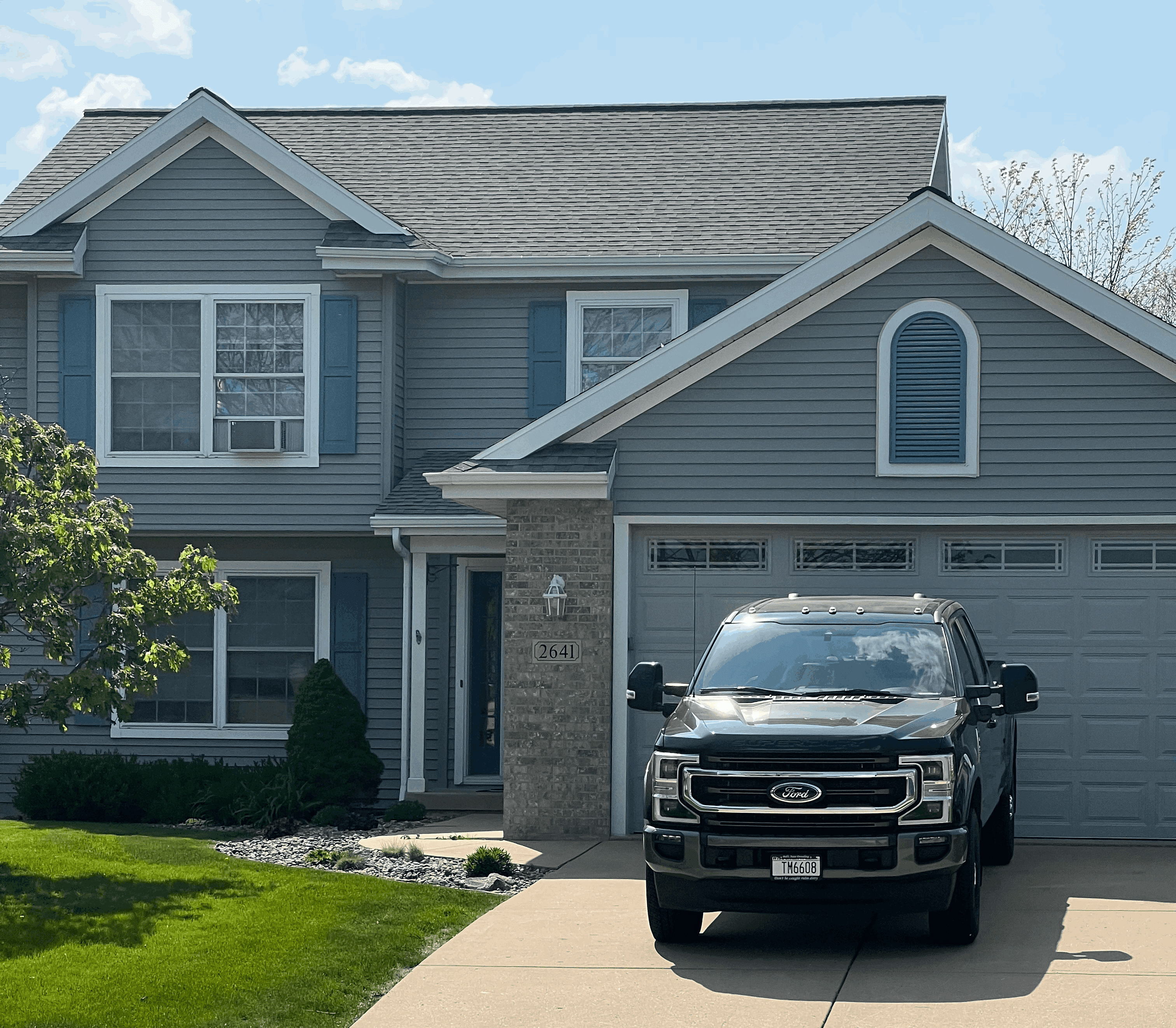 Pressure wash, scrape and sand loose paint, spot prime bare areas, caulk gaps where needed, and apply 1–2 coats of premium exterior paint on siding and fascia. Protection of concrete and landscaping included.